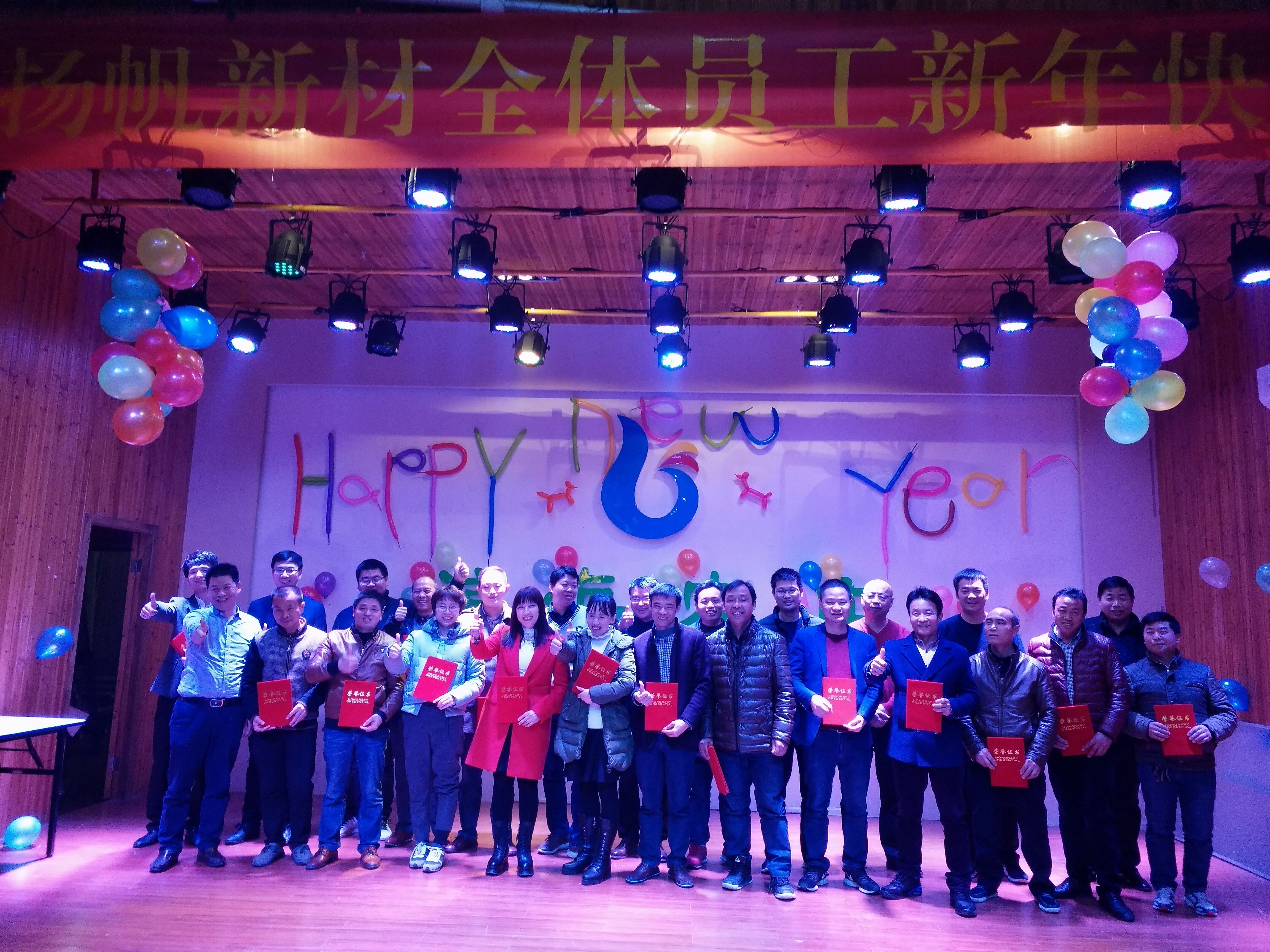 2017年1229日晚,浙江揚帆新材上虞生產基地2018新年聯歡晚會在濱海農莊隆重舉行,公司上下歡聚一堂,共賀新年。參加晚會的有上虞生產基地的全體干部員工、揚帆新材李耀土總裁、同濟大學金明教授等多位領導和嘉賓。