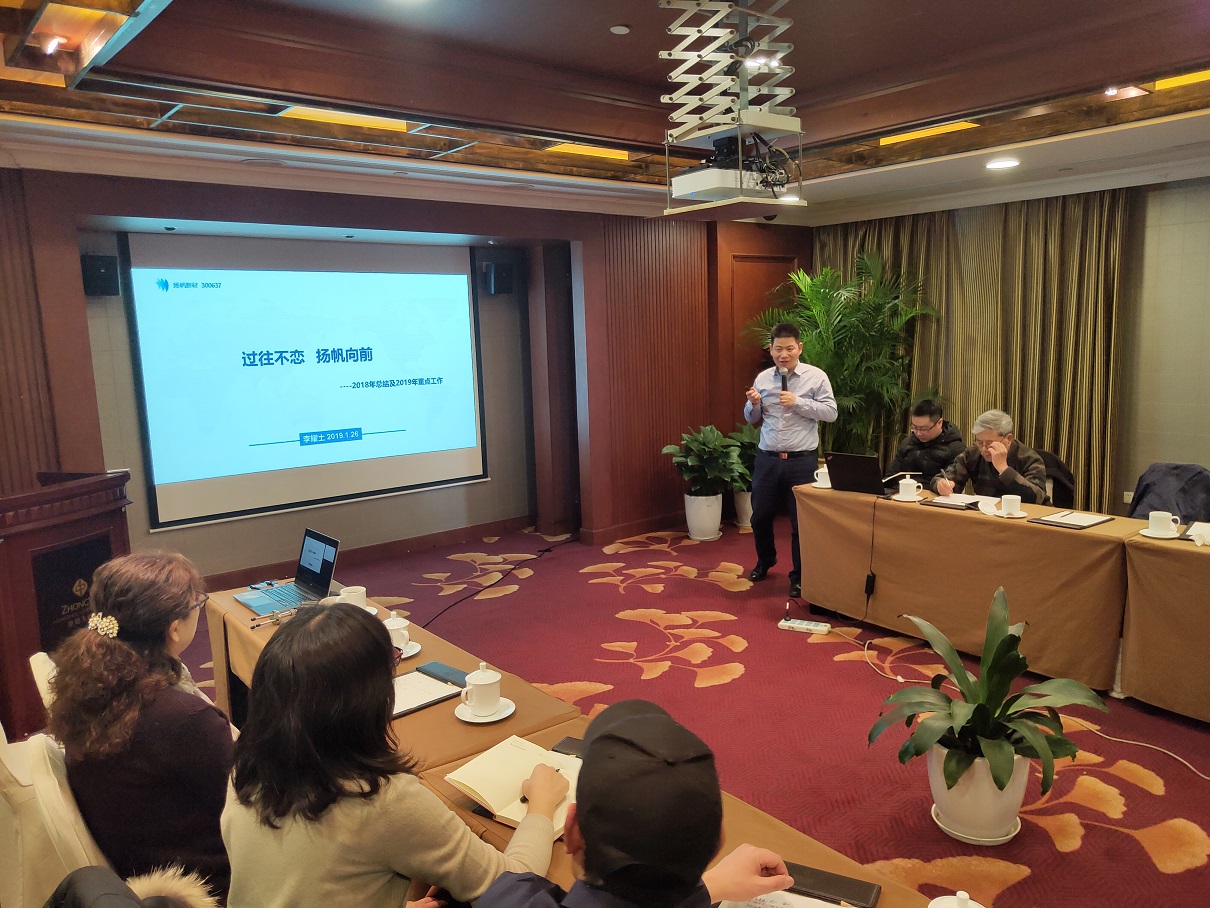 2019年1月26日,揚(yáng)帆新材年度高管會(huì)議在杭州召開(kāi),公司控股股東浙江揚(yáng)帆控股集團(tuán)有限公司董事長(zhǎng)樊培仁,揚(yáng)帆新材董事長(zhǎng)樊彬,總裁李耀土,副總裁朱俊飛、陶明、劉輝,財(cái)務(wù)總監(jiān)上官云明,技術(shù)總監(jiān)吳紅輝,董事會(huì)秘書(shū)樊相東以及各子公司高管悉數(shù)出席并作年度工作報(bào)告。