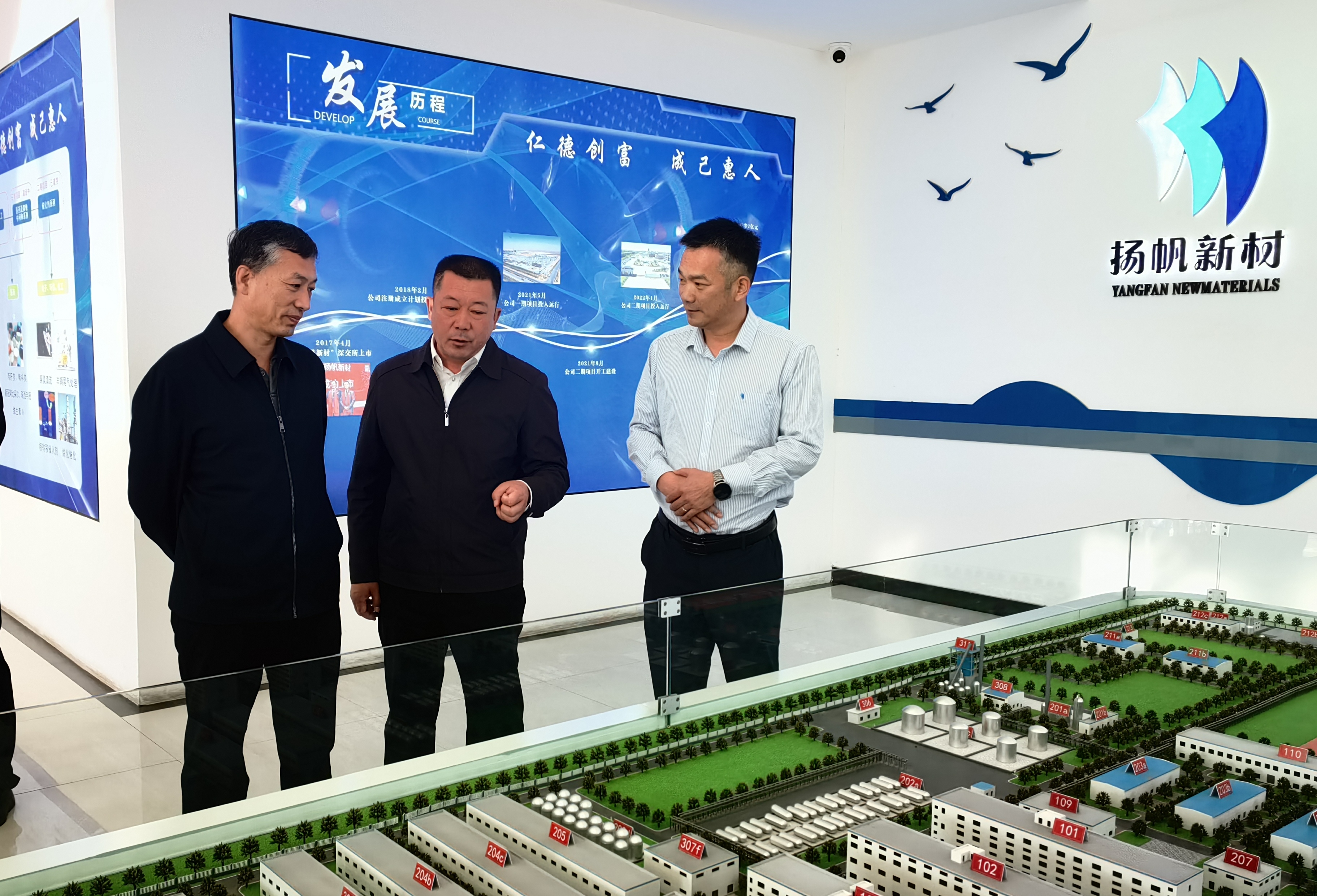 在公司展廳,包副盟長對公司的發展歷程、項目(產品)介紹、廠區規模和企業文化逐一進行了了解,揚帆新材常務副總裁劉輝圍繞公司產品、原料、市場以及發展現狀向工作組領導進行了詳細的匯報,包副盟長聽后,對企業的發展表示了肯定,并重點就企業發展過程中存在的困難以及需要政府解決的問題征詢了意見,鼓勵企業做好產品的同時對市場預期要充滿信心,特別強調企業生產一定要確保安全和環保這條底線,扎實推進企業又好又快發展。